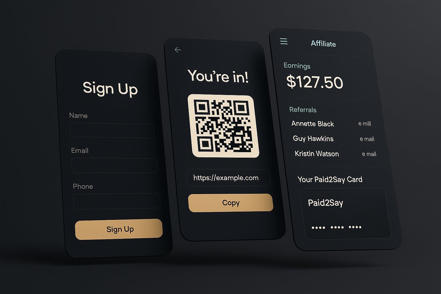 Friend visits → sale tracked → commission auto-loaded to their Paid2Say Card. No manual work.